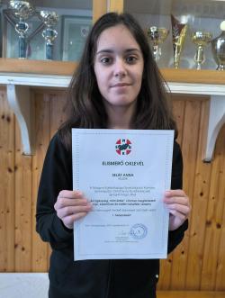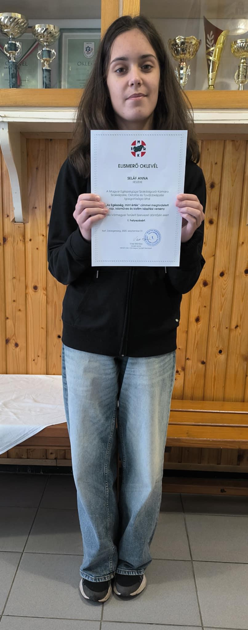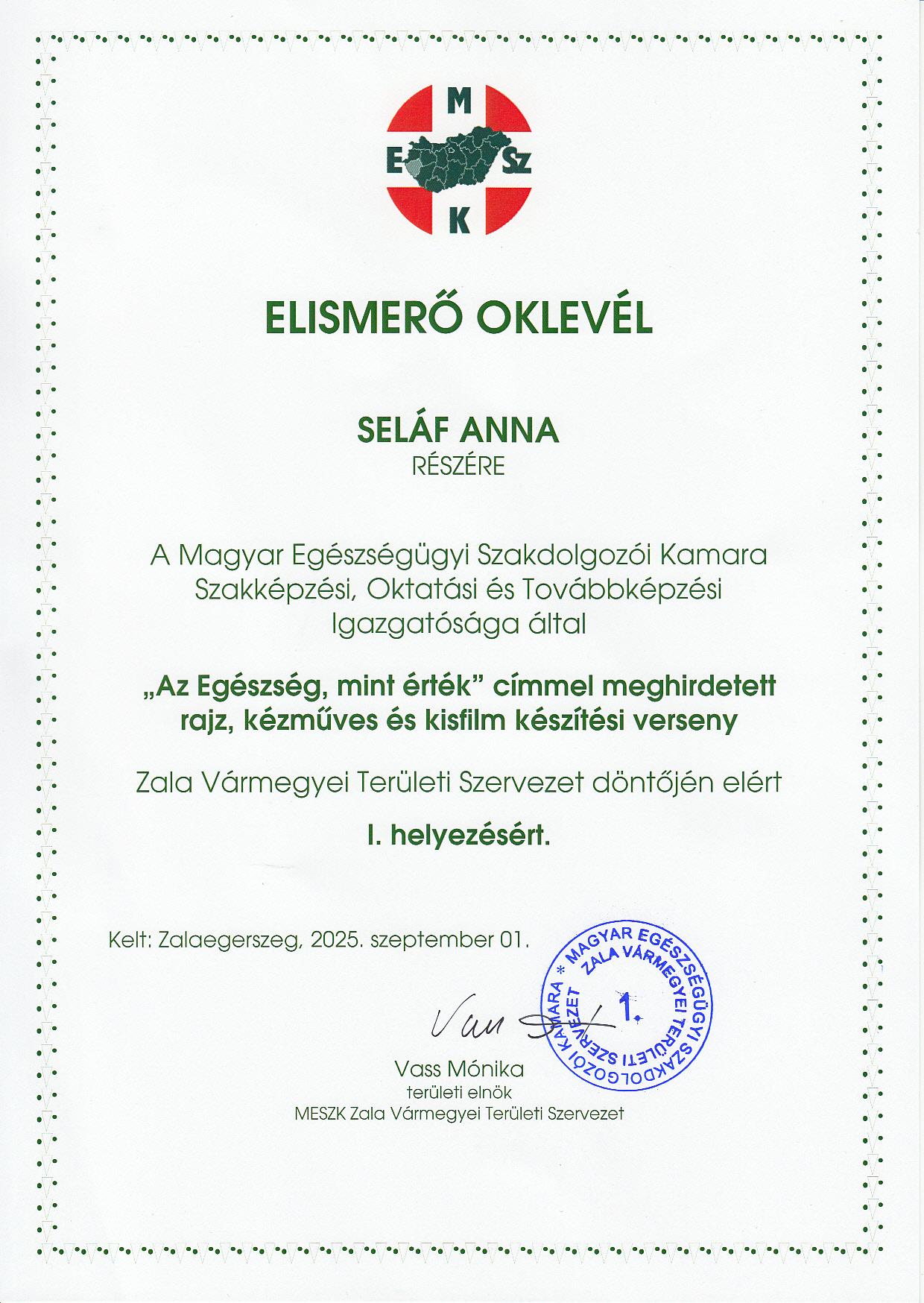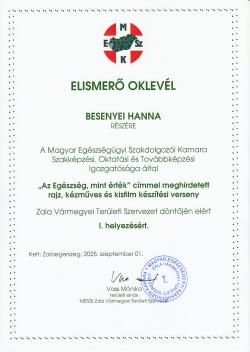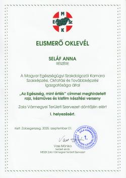 A Magyar Egészségügyi Szakdolgozói Kamara Szakképzési, Oktatási és Továbbképzési igazgatósága által „Az Egészség mint érték” címmel meghirdetett rajzpályázatra beküldött rajzával Besenyei Hanna és Seláf Anna korosztályában első helyezést ért el.