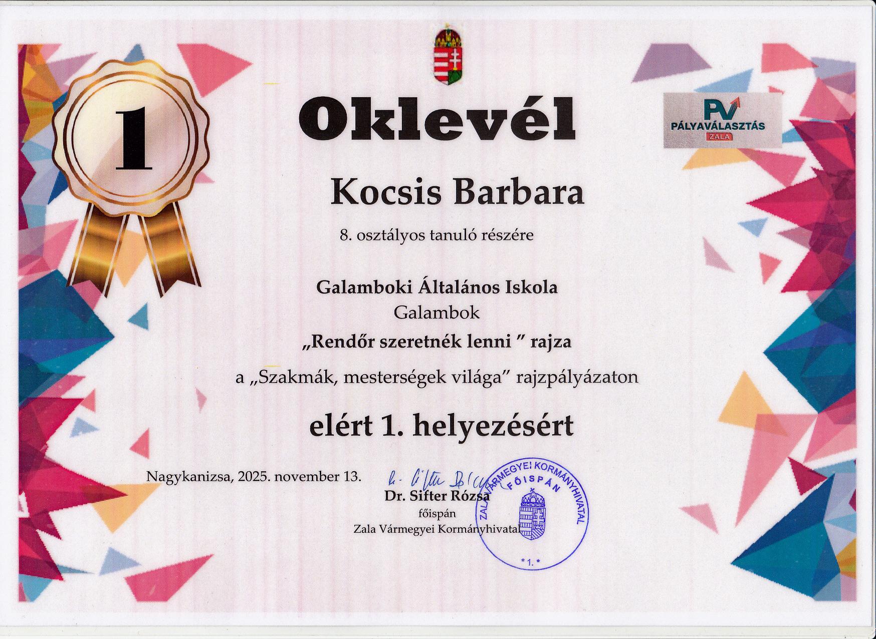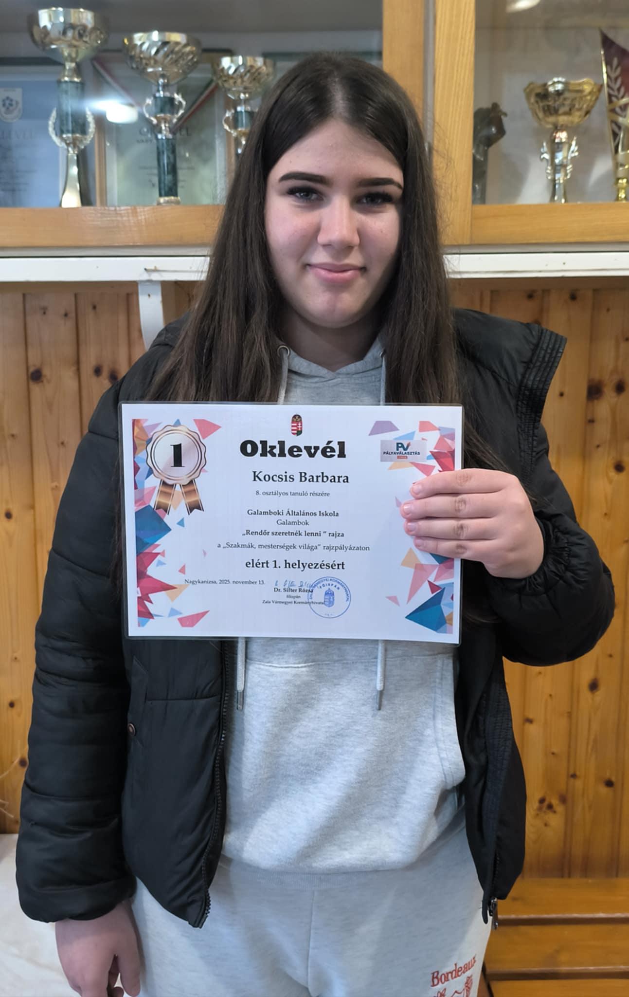 A Zala Vármegyei Kormányhivatal által meghirdetett "Szakmák, mesterségek világa" rajzpályázaton iskolánk 8. osztályos tanulója Kocsis Barbara, a "Rendőr szeretnék lenni" rajzával I. helyezést ért el.