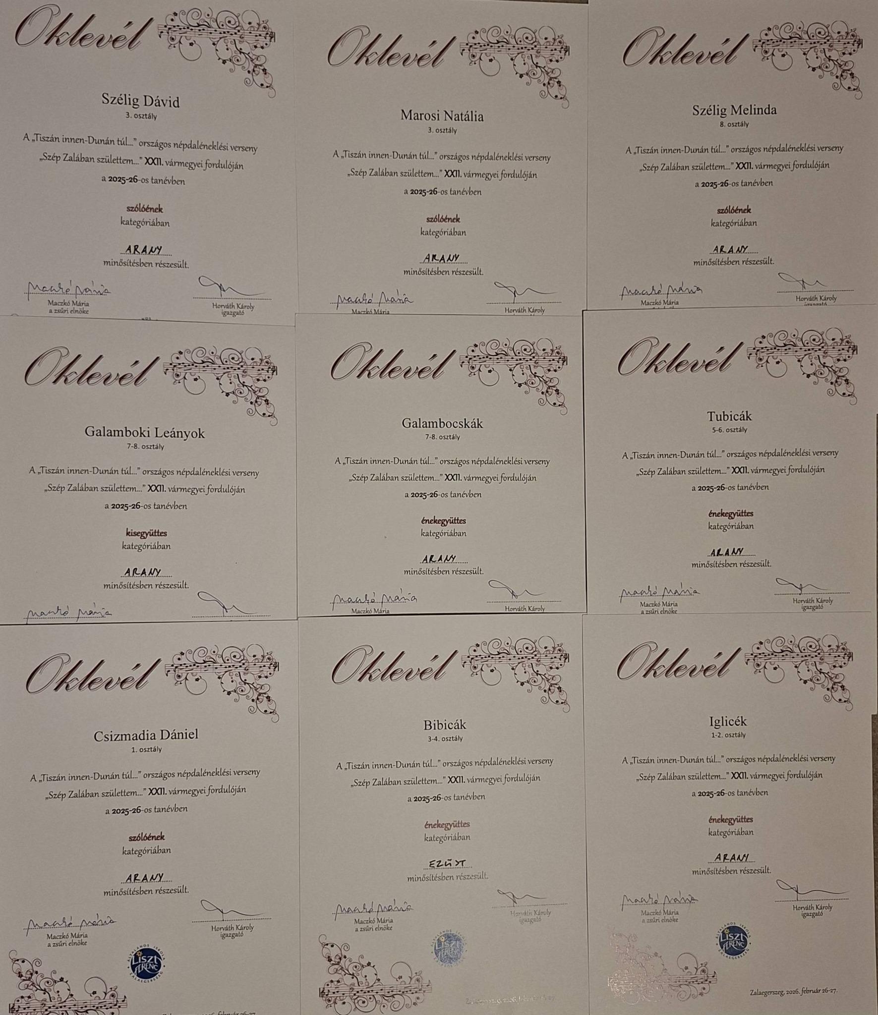 A ,,Tiszán innen-Dunán túl..." országos népdaléneklési verseny ,,Szép Zalában születtem..." vármegyei fordulóján iskolánk diákjai ismét szépen szerepeltek.